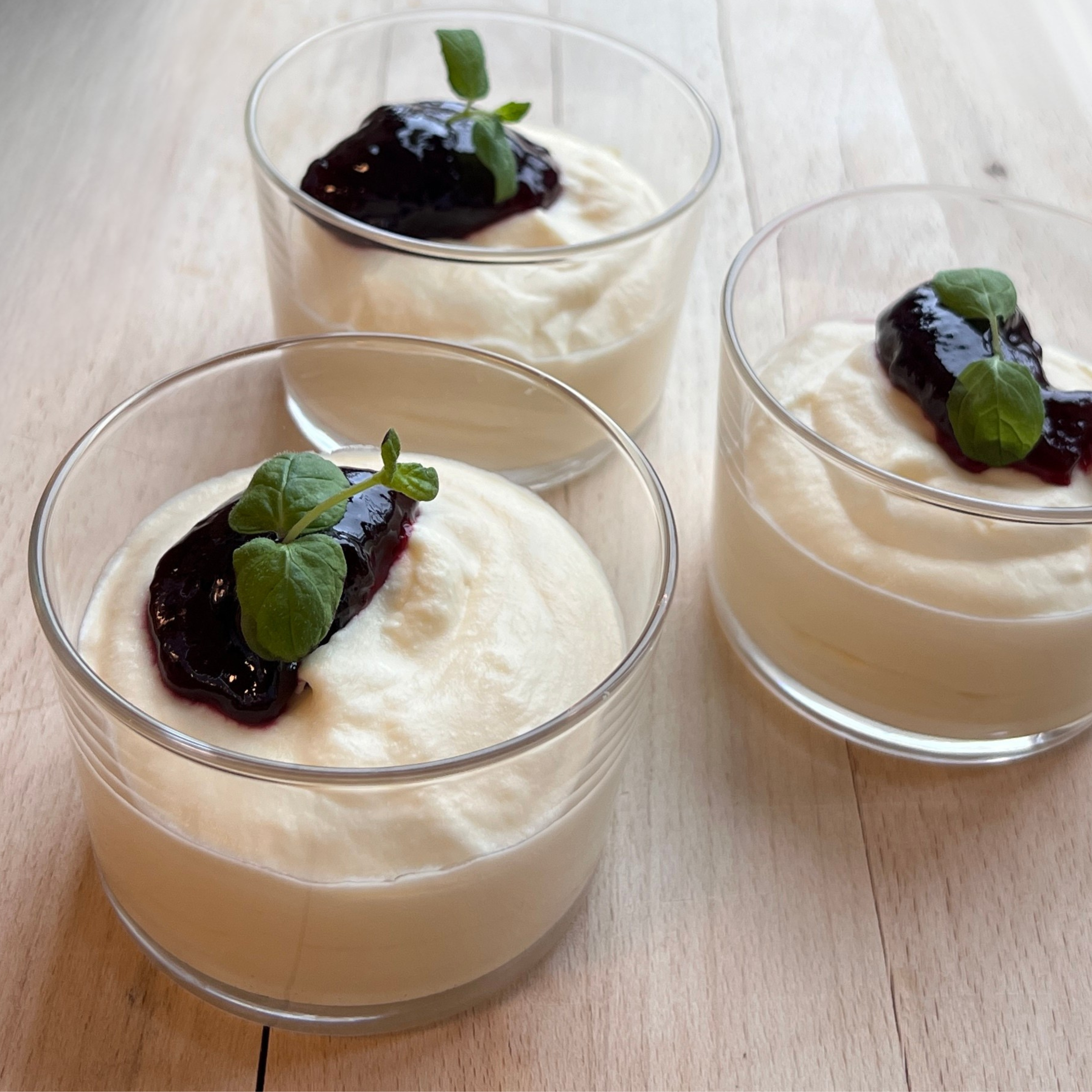 Dessertene leveres i porsjonsskåler, klare for servering. Skålene er av glass.