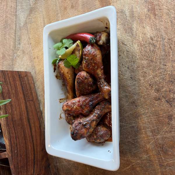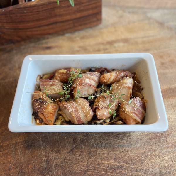 Melk - Kyllingfilet med honning og chipotle marinade, surret med bacon og gratinert med sweet chilisaus og parmesan.