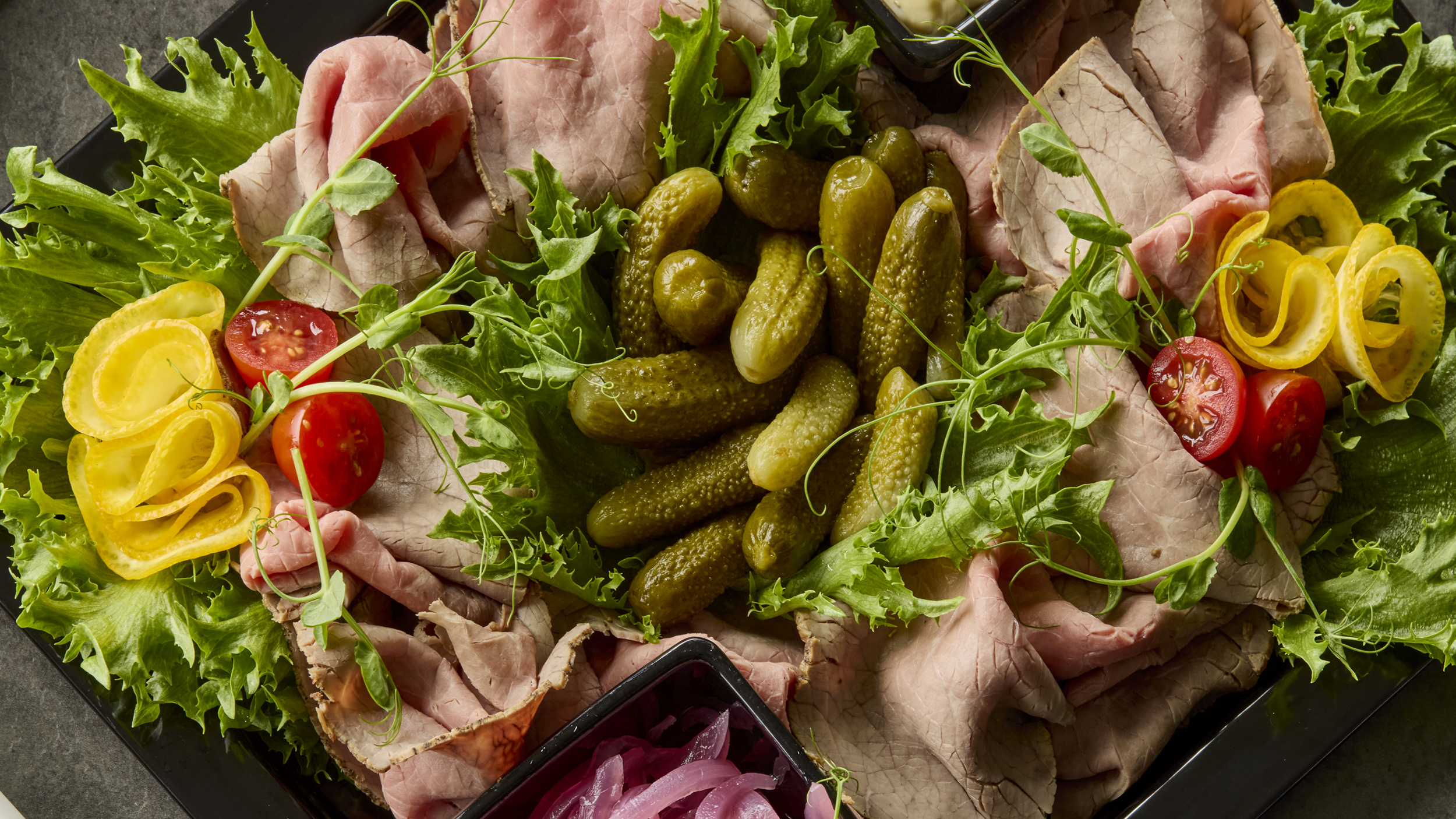 - Roastbiff med syltet rødløk og cornichons