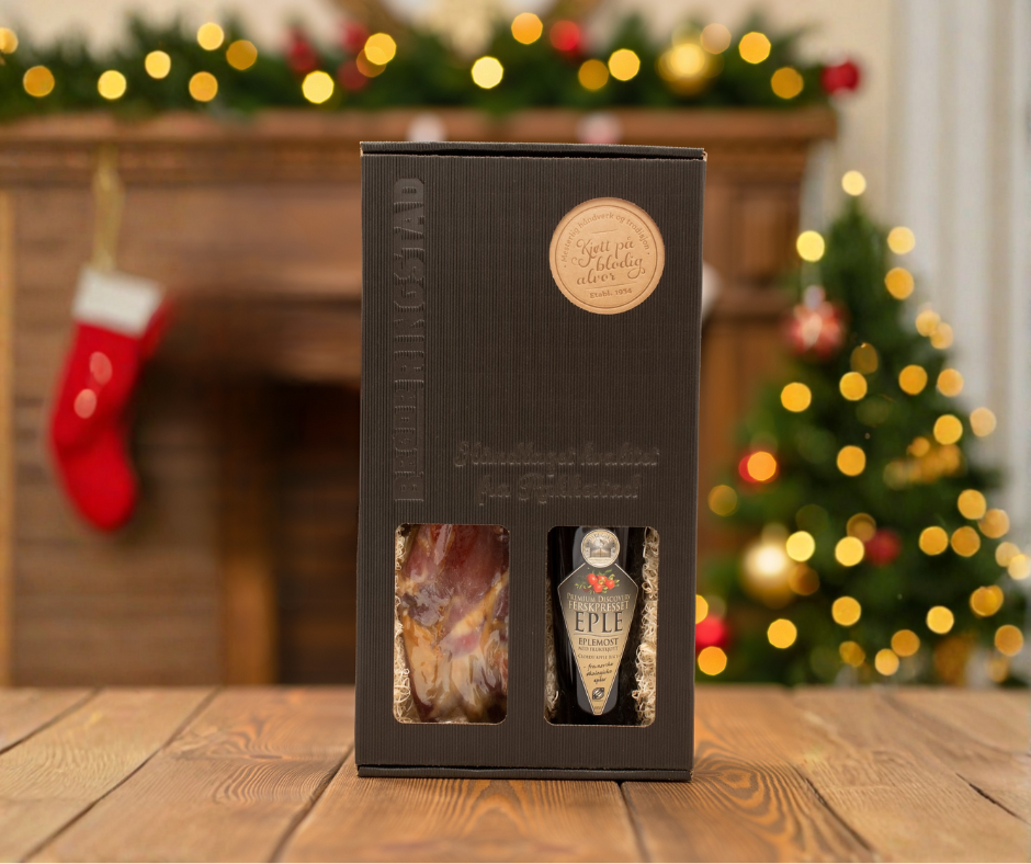 Fenalåret og eplemosten pakkes i en elegant sort eske fra vår samarbeidspartner Grønn Emballasje. Esken fylles med treull for å sikre at både fenalåret og flasken overleveres hele.