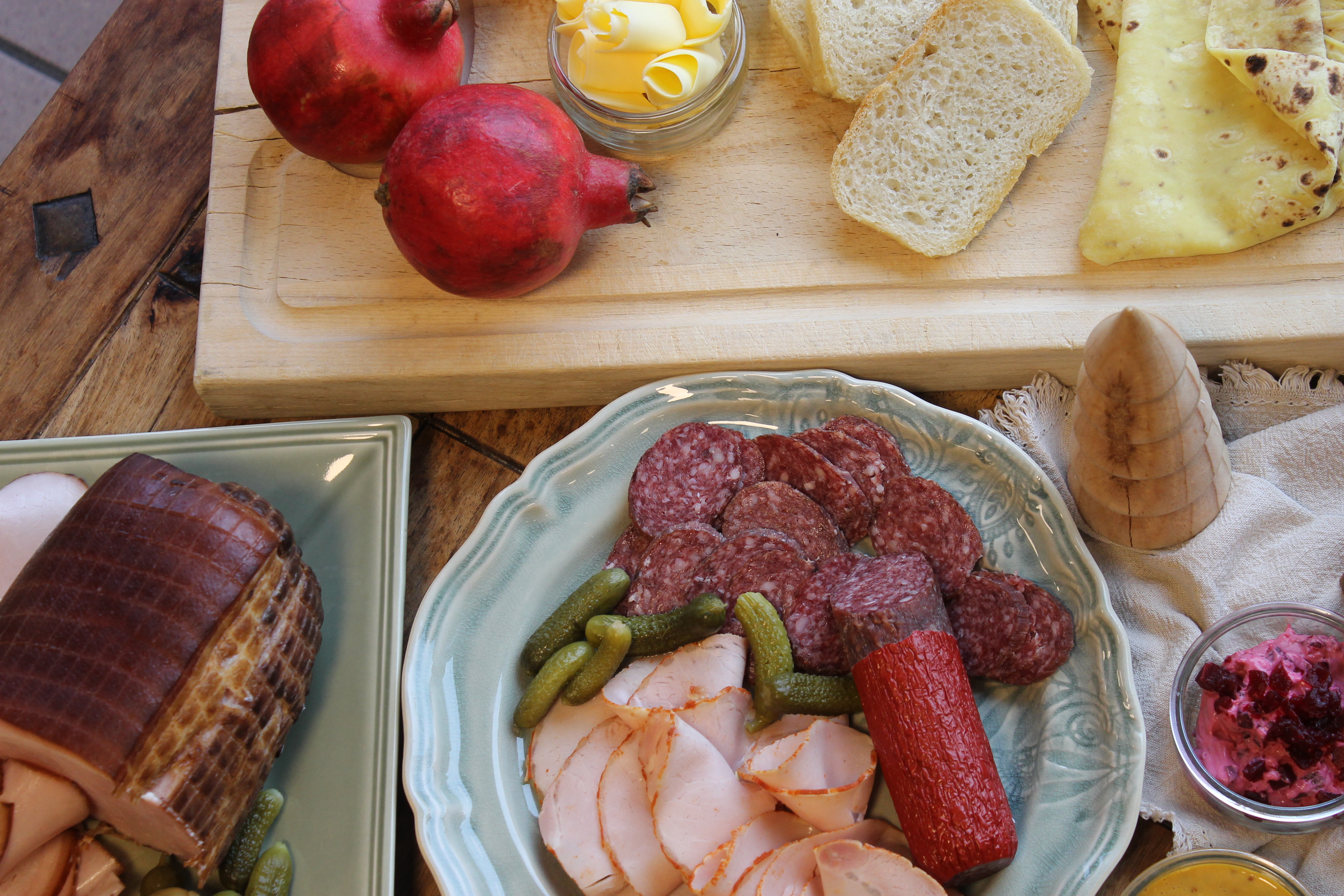 Skåret rødvinspølse på frokostbordet.