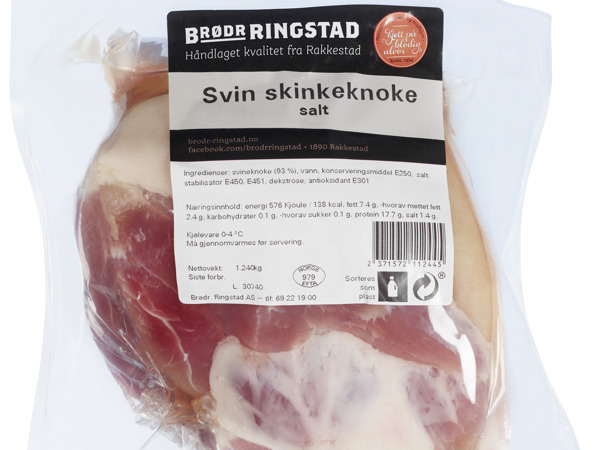 Ingredienser: svineknoke (93 %), vann, konserveringsmiddel E250, salt, stabilisator E450, E451, dekstrose, antioksidant E301
