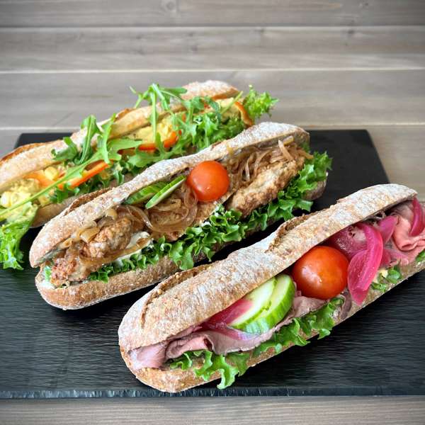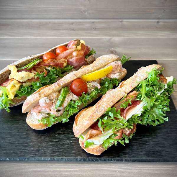 Baguettene lages av utrolig godt brød, er 27 cm lange og fylt til randen med pålegg, tilbehør og grønnsaker.