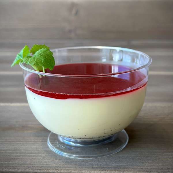 - Husets panna cotta med bringebærcoulis (6) pyntes med friske bær 109,- / stk