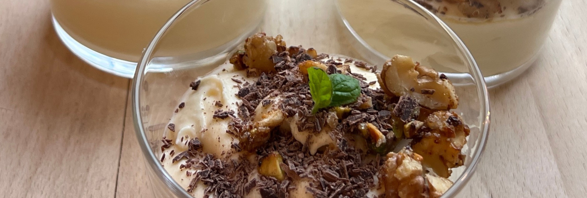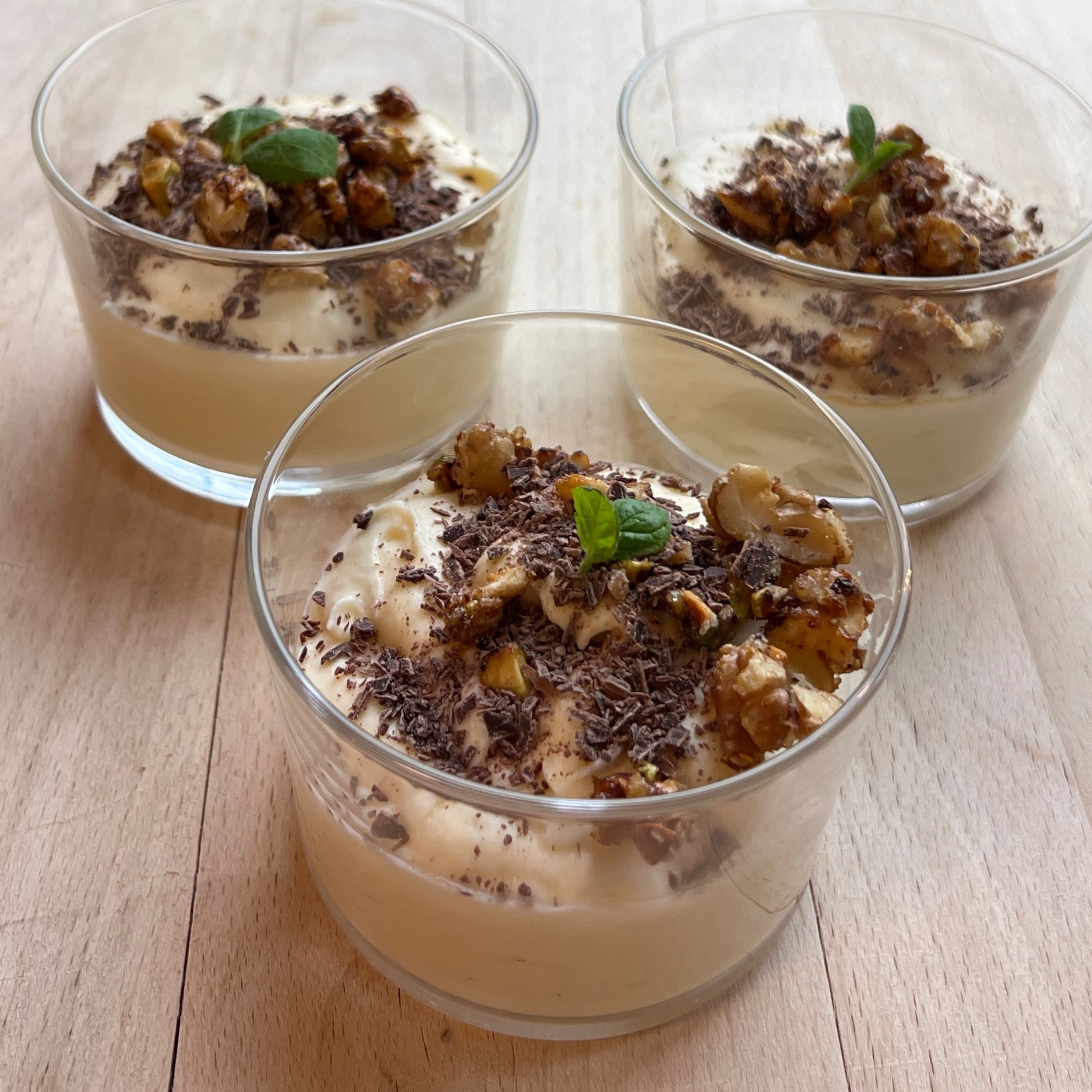 Dessertene leveres i delikate skåler, klare for servering. Det meste lager vi selv fra bunnen av.