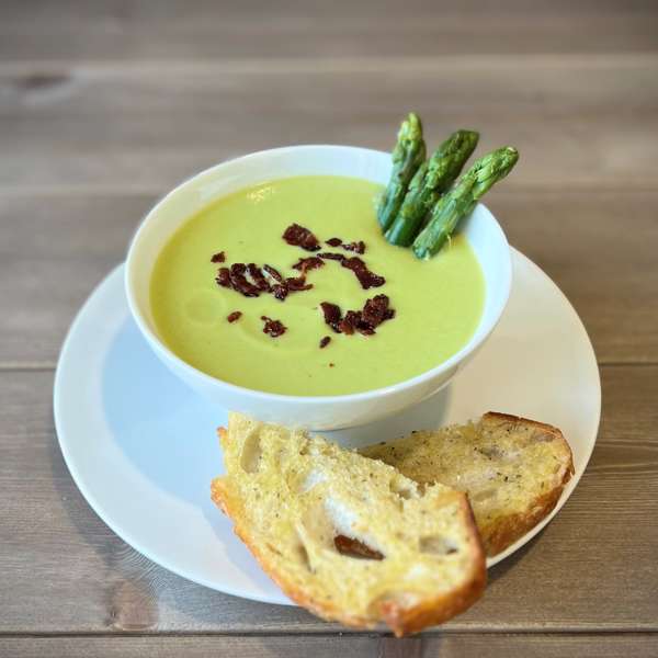 - Kremet aspargessuppe med sprøstekt bacon (6) 149,-