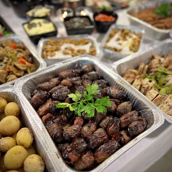 Rettene leveres på fat og i boller, og varmrettene kommer i folieform for oppvarming. Fat og boller skal returneres innen 3 virkedager.