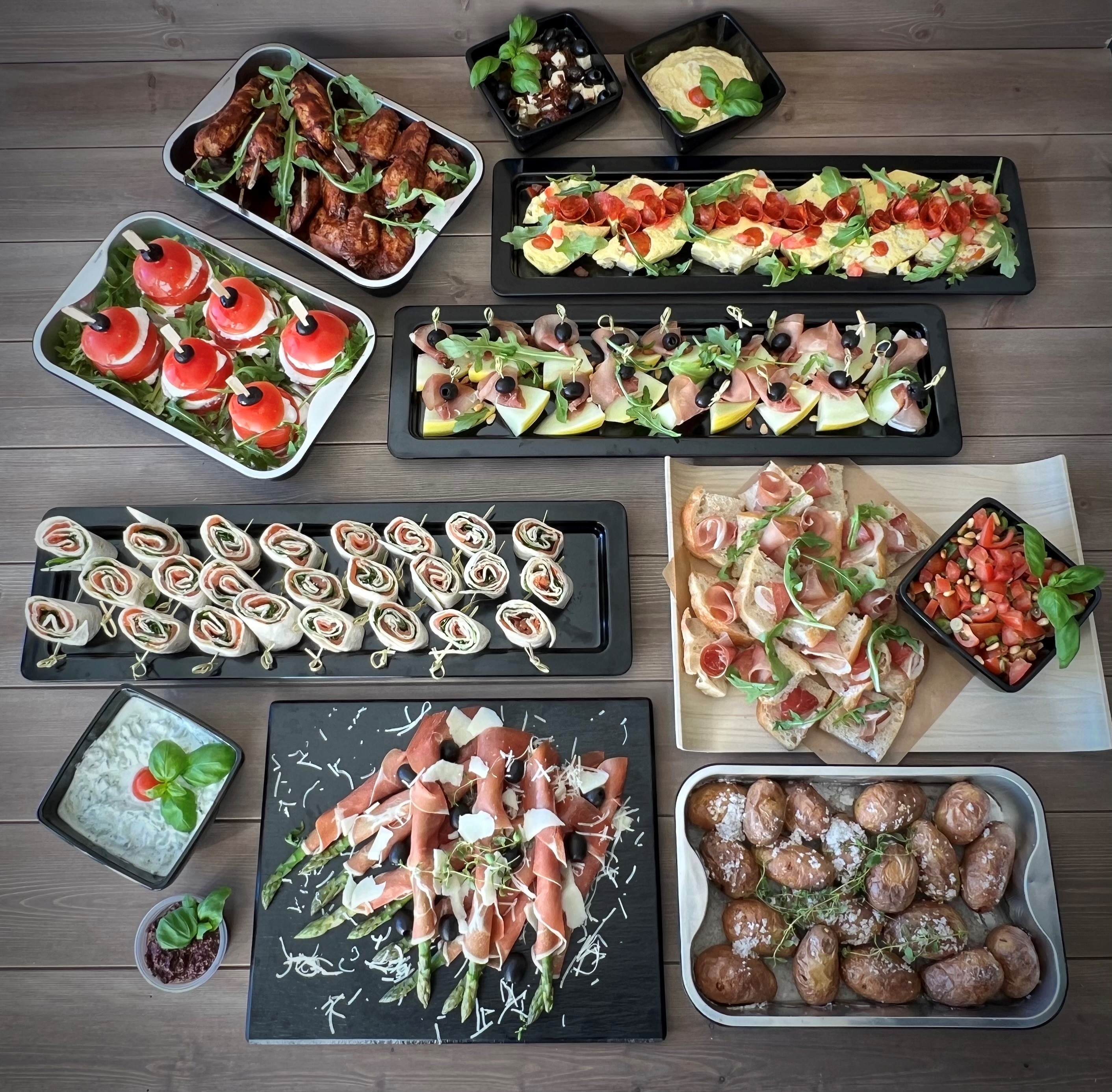 Koldtbordet leveres på fat og i boller, og varmrettene kommer i ildfaste fat for oppvarming. Fat og boller skal returneres innen 3 virkedager.