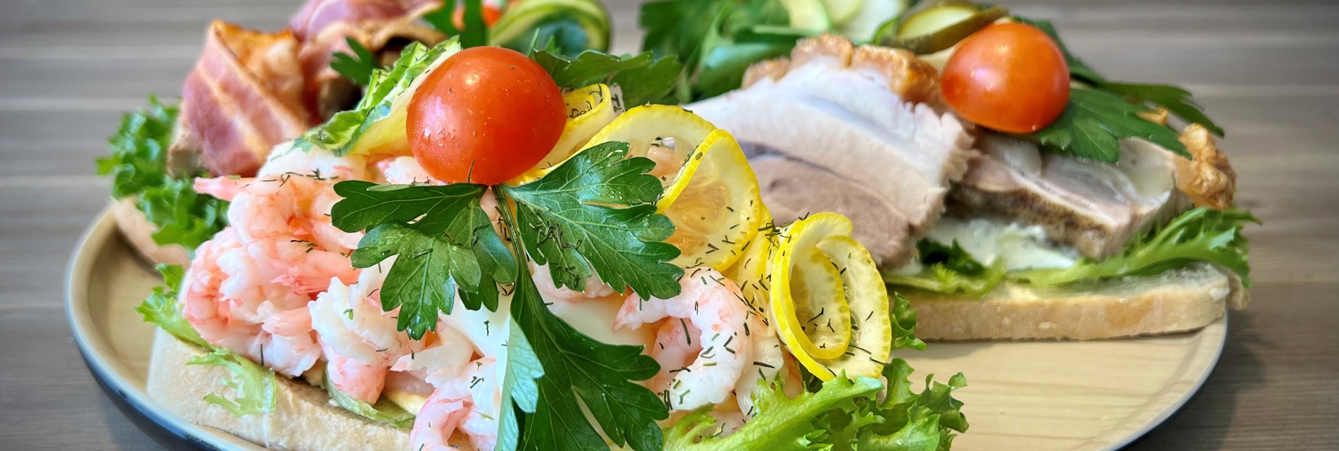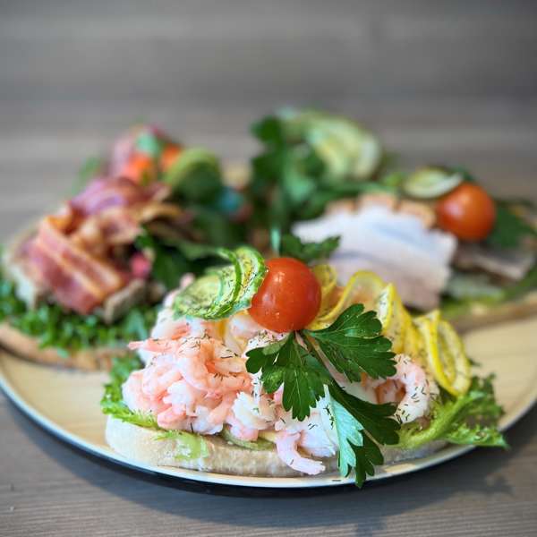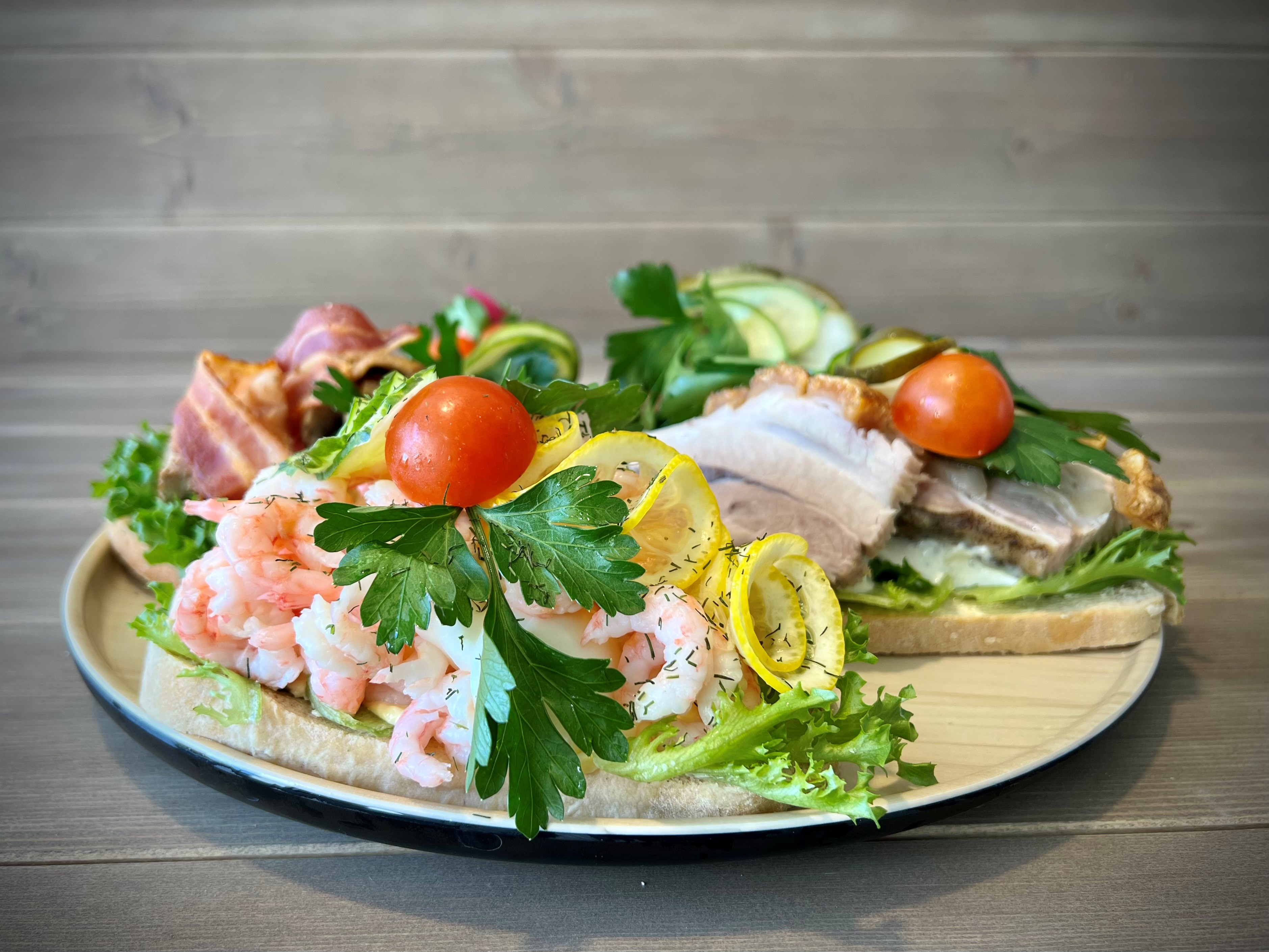 - Rekesmørbrød med håndpillede reker, kokt egg, skagensalat og rødløk (1,2,3,6)