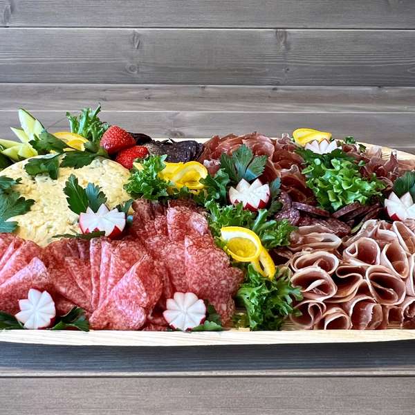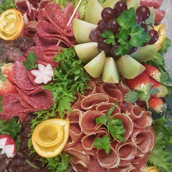 Spekematen er lagt klar på serveringsfat og pyntet m/frukt og bær (sesongavhengig)